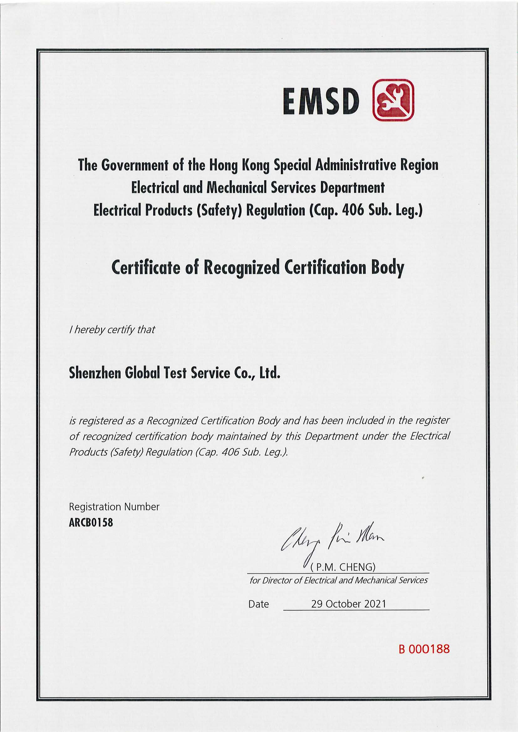 2021年10月29日全球通檢測榮獲《香港特別行政區機電工程署電氣產品(安全)規例》(第406章)認可認證機構證書,已注冊為認可核證機構,并已列入香港機電...